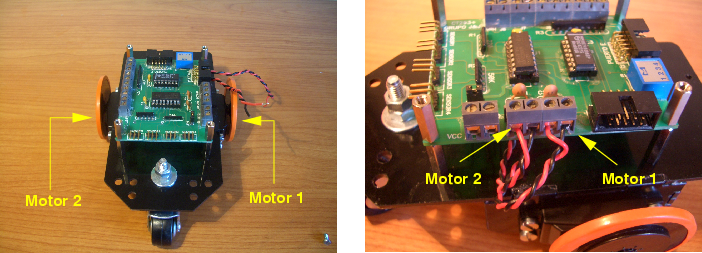 Paso 4.Conectar los cables de los motores a las clema de la tarjeta CT293+. Según se mira el robot como en la foto de la izquierda, el motor 1 es el situado a la derecha y el 2 el de la izquierda. Los cables se atornillan a las clemas correspondientes que llevan las serigrafías motor 1 y motor 2.