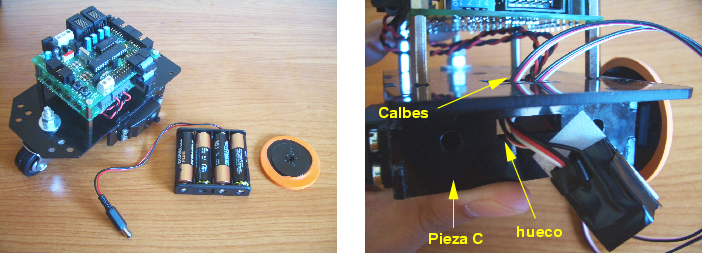 Paso 4. Quitar una rueda y extrar el portapilas. Introducir los cables de los sensores por el hueco rectangular de la pieza C, en la parte frontarl del robot. Sacar los cables hacie el exterior del robot a través del otro hueco rectangular de la pieza A.