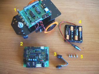 1) Robot después de montar la etapa de potencia 2) Tarjeta Skypic, “el cerebro” 3) Cable de cinta plana con sus conectores 4) Portapilas 5) Cuatro tornillos para los separadores, de 8mm de largo y 2mm de diámetro |