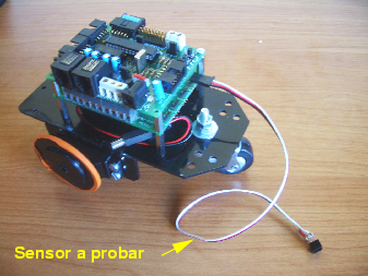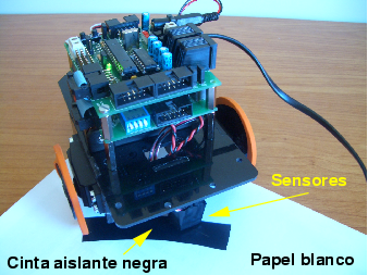 Colocar un papel blanco con un trozo de cinta aislante negra y pasar el robot por encima. Comprobar que los el valor de los sensores que se muestran en pantalla cambian.