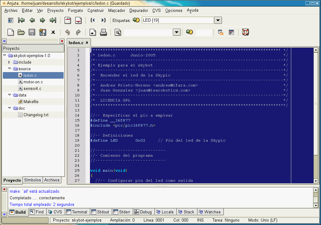 $ tar vzxf hola-mundo-linux.tgz $ cd hola-mundo-linux $ ls ledon.c Makefile pic16f877.h skybot-hola-mundo.prj |