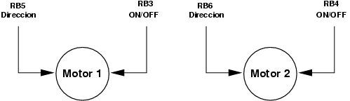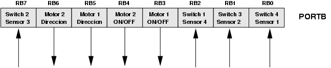 Los bits RB0, RB1, RB2 y RB7 hay que configurarlos como entradas para poder leer los sensores. Los bits RB3, RB4, RB5 y RB6 hay que configurarlos como salidas para poder mover los motores.