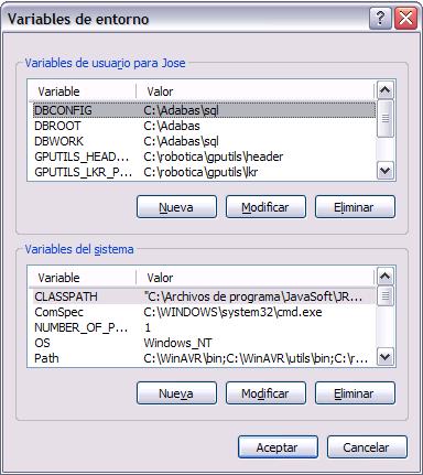 En la parte de abajo de la ventana vemos que pone Varibles del sistema, ahí buscaremos una entrada que se llama “Path”. La pinchamos una vez con el ratón, y pulsamos el botón que pone “Modificar”. Ahora, es importante que no borremos nada en el path, lo que vamos a hacer es añadir unas palabras, a continuación de lo que hay escrito, para ello ponemos literalmente: “ ;C:\robotica\utils\bin ” (Sin las comillas obviamente).