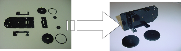 Este es el aspecto que tienen el chásis y las rudas. En la figura de la izquierda se muestra en su posición normal. Sobre la superfie se colocará la electrónica, en los laterales irán atornillados los servos y en la parte trasera se situará la rueda loca.