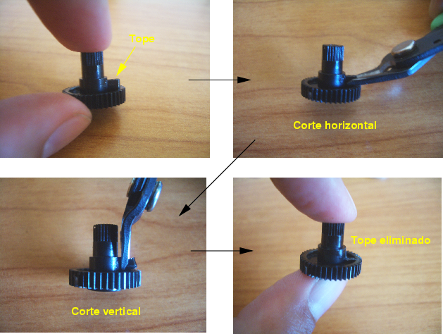 PASO 9. Eliminar el tope mecánico del engranaje E1. ESTA ES LA PARTE MÁS CRÍTICA. Utilizar unos alicates que estén bien afilados y que no sean muy grandes o un cutter. El tope se quita facilmente haciendo un corte horizontal y otro vertical con los alicates o el cutter. Prestar especial atención a no cortar nada más. Sólo el tope.