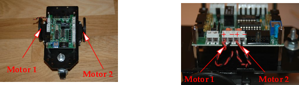 Paso 4.Conectar los cables de los motores a las clema de la tarjeta SKY293. Según se mira el robot como en la foto de la izquierda, el motor 1 es el situado a la izquierda y el 2 el de la derecha. Los cables se atornillan a las clemas correspondientes que llevan las serigrafías motor 1 y motor 2. El cable rojo es el positivo (indicado como +) y el negro el negtivo (indicado como -).