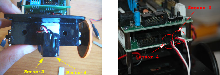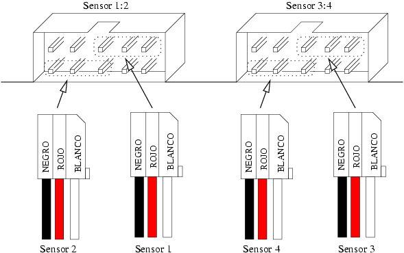 Paso 6. Pasar los cables de los sensores por el hueco entre la SKY293 y la superficie de la estructura (el hueco donde va el portapilas), llevarlos a la parte trasera y conectarlos a la tarjeta SKY293. Colocarlos como se indica en la figura, para que los programas de prueba funcionen sin tener que cambiar nada.