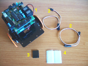 1) Robot, en el estado en el que se dejó en el paso “Conexión de la Skypic” 2) Los sensores, protegidos con cinta aislante 3) Pieza de plástico negra 4) Trozo de velcro |