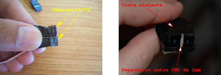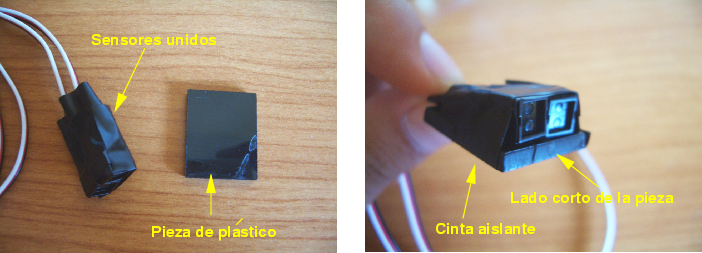 Paso 1. Juntar los dos sensores y envolverlos con cinta aislante, para que queden juntos. Se recomienda dejar 1mm de separación entre los sensores, se puede poner un poco de cartón u otro material para realizar dicha sepación. (Ver siguiente figura)