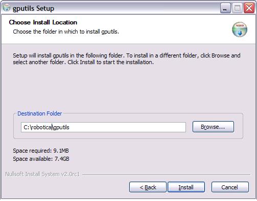 Ahora decidimos en que ruta podemos instalar el programa. En este caso queremos cambiar la que figura por defecto, pulsaremos en el botón “Browse” y elegiremos la ruta alternativa de instalación, o bien la escribiremos nosotros. Es importante que la ruta final sea “C:\robotica\gputils” para el correcto funcionamiento de los diferentes programas. La ventana, tras pulsar “Install” es: