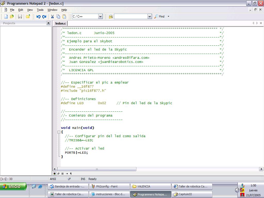 accediendo al fichero Makefile que hay en el directorio del ejemplo y que contiene las instrucciones para compilar el programa. Es importante que los PATHs y nombres que aparecen en ese fichero se coincidan con los del proyecto. Para crar un proyecto nuevo se recomienda copiar el Makefile del ejemplo Hola Mundo y además copiar el fichero pic16f877.h, que contine todas las declaraciones de los PUERTOS y REGISTROS del PIC. Sin este archivo no podreis hacer PORTB=0x02 para encender el LED, ya que al compilar os saldrá un error diciendo que no sabe que es PORTB.