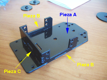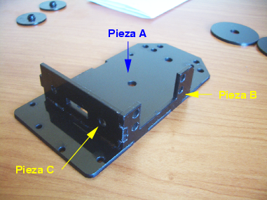 Pegar el otro lateral. Pegar la pieza B que falta, que está en contacto con la A y con la C. Con esto finaliza la primera parte de la construcción del chásis del robot. Dejar la estructura reposar al menos durante 2 horas para que el pegamento se seque y las piezas se vayan fijando.