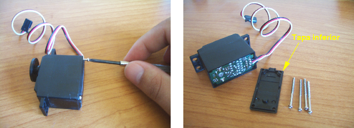 PASO 2. Con el mismo destornillador, quitar los 4 tornillos de la parte inferior y sacar la tapa. La circuitería del servo quedará al descubierto.