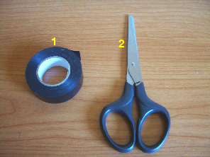 1) Rollo de cinta aislante 2) Tijeras para cortar la cinta aislante |