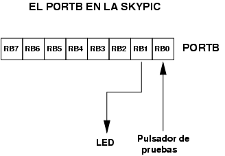 En la tarjeta Skypic hay un pulsador de pruebas (el que está al lado del reset) y un led, conectados a los bits RB0 y RB1 respectivamente. Por ello, si se quiere acceder al led, habrá que configurar el bit RB1 de salida. Si se quiere leer del pulsador, habrá que configurar el RB0 como entrada.