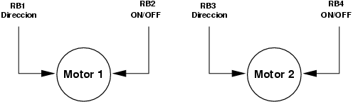 Para mover los motores y por tanto controlar el robot sólo hay que dar valors a los bits RB4, RB3, RB2 y RB1 del puerto B del PIC. Es decir, el robot se mueve escribiendo valores en el puerto B. Para leer los sensores, sólo hay que leer el puerto B y conocer en qué estado están los bits RB0, RB5, RB6 y RB7.
