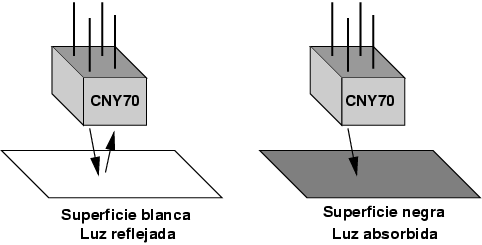 Los sensores de infrarrojos CNY70 tienen incorporado un emisor y un receptor en el mismo encapsulado. Están constantemente emitiendo luz infrarroja. Si a poca distancia existe una superficie blanca, la luz se refleja y es captada por el receptor. Si la superficie es negra, absorbe la mayor parte de la luz y el detector no recibe nada.