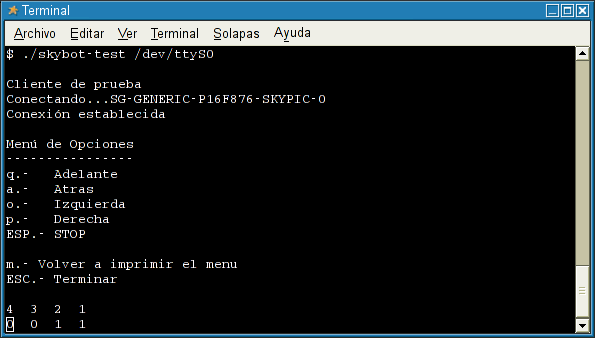 Ejecutar el skybot-test, indicando el dispositivo serie. Si no se especifica ninguno se toma por defecto el /dev/ttyS0