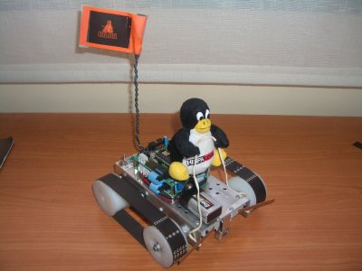 Lo divertido de robots como el Skybot es que son totalmente “tuneables”. En la izquierda se puede ver un prototipo al que le han colocado un chásis protector y una pala conectada a un servo para volcar a los contrarios. En la derecha está la versión tuneada del robot clónico, con un tux dirigiéndolo ;-)