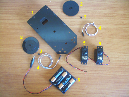 1) Chásis del robot 2) Ruedas 3) Tornillos del eje de los servos 4) Cables para los sensores 5) Servos trucados y probados 6) Portapilas con sus pilas y comprobada su tensión de salida. |
