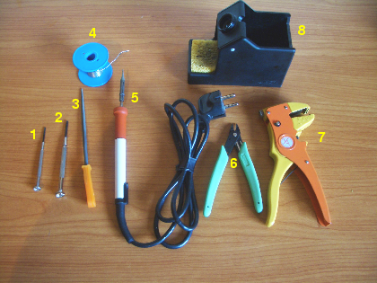 1) Destornillador pequeño de cabeza plana 2) Destornillador pequeño de cabeza en estrella 3) Lima 4) Rollo de estaño de 1mm 5) Soldador de punta fina 6) Alicates para cortar 7) Pelacables (opcional) 8) Soporte para soldador (Opcional) |