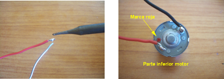 PASO 6. Soldar los cables. Tomar un cable rojo y negro de unos 25cm de longitud cada uno y soldarlos a los pines del motor. Primero pelar los cables y estañearlos (significa poner un poco de estaño en la zona pelada calentándolo con el soldador). Después soldarlos a los pines. Soldar el cable rojo al pine que tiene un punto rojo y el negro al otro.