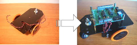 Paso 4.Conectar los cables de los motores a las clema de la tarjeta SKY293. Según se mira el robot como en la foto de la izquierda, el motor 1 es el situado a la derecha y el 2 el de la izquierda. Los cables se atornillan a las clemas correspondientes que llevan las serigrafías motor 1 y motor 2.