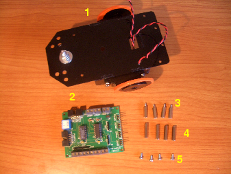 1) Estructura 2) Tarjeta SKY293. Etapa de potencia 3) Cuatro separadores macho-hembra 4) Cuatro separadores hembra-hembra 5) Cuatro tornillos para los separadores, de 8mm de largo y 2mm de diámetro |