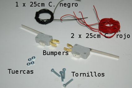 Vamos a colocar los sensores de contacto o bumpers en el robot. Los situaremos en la parte frontal y nos servirán para detectar obstáculos delante del robot. El funcionamiento de un Bumper es muy sencillo, básicamente es un interruptor, de tal manera que al apretar la palanca se cierra un circuito. Nosotros utilizaremos esto para introducir por uno de los pines del micro un "1" o un "0" según tengamos o no apretado el bumper.