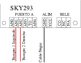 En la siguiente tabla vemos la correspondencia entre las clemas de la SKY293 y el Puerto A de la SKYPIC. Nosotros vamos a leer el estado de los bumpers por el puerto A del PIC. En ese puerto hay 6 entradas que se pueden configurar como entradas analógicas o como IOs digitales. Los bumpers son un sensor de entrada digital.