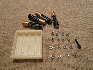 - Inicio: Imprimir el portapilas y obtener todo el material necesario: : portapilas, 4 pilas AAA, 4 tornillos M3 de 6mm de largo, 4 tuercas M3 y un tornillo M3 de 12mm