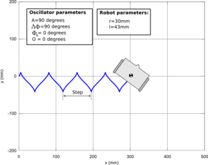 | − | {| | + | | [[Archivo:Limited-wheel-figure-5.png|thumb|300px|center|'''Figure 5''': Typical trajectory described by a differential mobile robot with limited wheels constrolled by means of two oscillators (''click to enlarge'')]] |