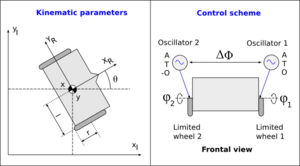 | + | | [[Archivo:Limited-wheels-figure-4.png|thumb|300px|center| '''Figure 4''': On the left: Kinematic parameters and refernce frames. On the right: control scheme of a differential drive robot with two limited wheels (''click to enlarge'') ]] | ||