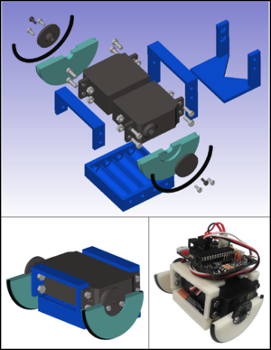 | + | | [[Archivo:Miniskybot-limited-freecad-1.png|thumb|300px|center|'''Figure 10''': The mobile robot built for the experiments. It is a modified version of the Miniskybot robot with limited wheels]] | ||