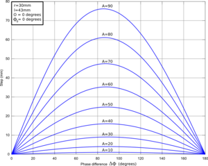 | + | | [[Archivo:Limited-wheels-figure-6.png|thumb|300px|center|'''Figure 6''': Variation of the step with the phase difference for different amplitudes (''click to enlarge'') ]] | ||