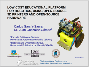 • Carlos García-Saura, Juan González-Gómez, "Low cost educational platform for robotics, using open-source 3D printers and open-source hardware". Proceedings of ICERI2012 Conference 19th-21st November 2012, Madrid, Spain, pp: 2699 - 2706. ISBN: 978-84-616-0763-1