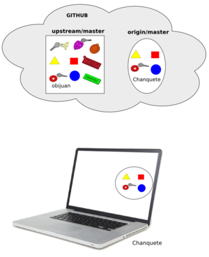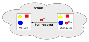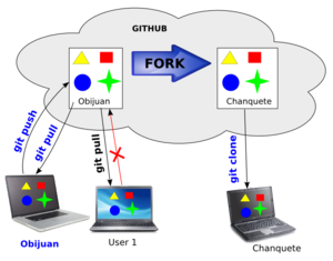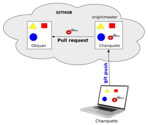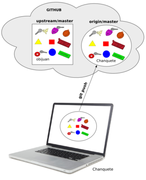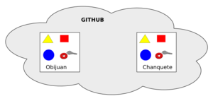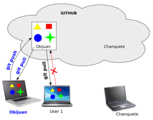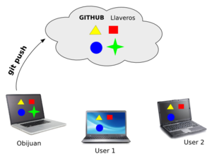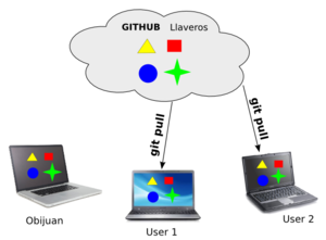 Uno de esos usuarios diseña un llavero nuevo y lo añade localmente. Supongamos que ese usuario es obijuan, y como tiene permisos de escritura en el respositorio, lo sube (usando el comando git push que veremos más adelante). Ahora el repo de obijuan y el de github están actualizados, pero el del resto de usuarios no