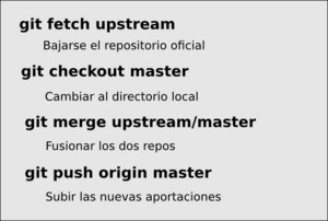 Como resumen, una vez que se tiene configurada la dirección del repositorio upstream, los comandos que hay que ejecutar para sincronizar el repo son los siguientes: