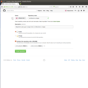 Para jugar al juego de las contribuciones a ciegas tenemos que crear un repositorio en nuestra cuenta de github. Entramos en github y en la parte superior derecha desplegamos el icono que tiene un +. Seleccionamos la opción new repository. Rellenamos los datos para crear el repositorio: