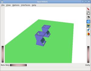 In the begining the environmnet is created (loaded from the file models/Unimod1.env.xml) and the camera view is set. The environment consist of one robot with only one module (Unimod).