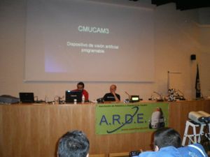 Después de la comida comenzó lo que todos estábamos esperando ansiosamente: las III Jornadas de robótica :-) La primera charla la dió Daniel Bayón, de Juguetronica.com. Nos habló sobre la CMUcam 3 y nos hizo una demostración en vivo de un robot con esta cámara (foto de la derecha).
