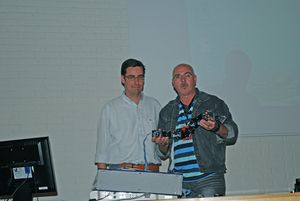 Después llegó mi charla, sobre "Robótica Modular y Locomoción" aunque, siguiente las recomendaciones de Pepe Ariza, la charla se tituló informalmente como "Robótica Gusanil" ;-). En la foto de la derecha estamos Francisco Balbuena (Robótika) y yo junto al robot Hypercube