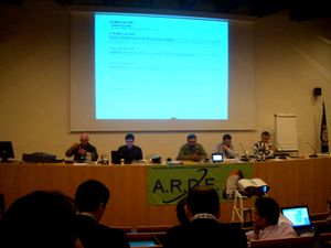 Las III Jornadas de ARDE se celebraron los días 21 y 22 de Marzo en el campus de las Rozas de la UNED, en Madrid (foto de la izquierda). La mañana del sábado se celebró la Asamblea general, presidida por los miembros de la junta directiva (foto de la derecha), que son, de izquierda a derecha: Francisco Balbuena, Francesc Constans, Vicente Torres, Francisco Reinoso y Francisco Javier Campoy.