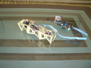 La robótica me puede, así que al final no pude resistir la tentación de llevar el prototipo Cube-M y hacer demostraciones durante mi presentación. Gracias a los Micro-osciladores, ya puedo hacer que los robots modulares sean autónomos y no necesito de un PC para hacer las demos. Todo es mucho más fácil :-)