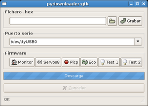 Pydownloader es una aplicación para descarga de programas en la Skypic. Es necesario previamente que el bootloader se encuentre ya grabado en la Skypic. Con el Pydownloader se puede: