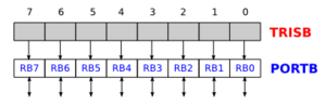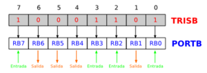 En la derecha se muestra un ejemplo de configuración. Se almacena el valor 0x8D hexadecimal en el registro TRISB, que se corresponde con el valor en binario 10001101. Los bits de TRISB que están a '1' configura el bit correspondiente del puerto B para que sea de entrada. Los bits que están a '0' lo configuran para salida.